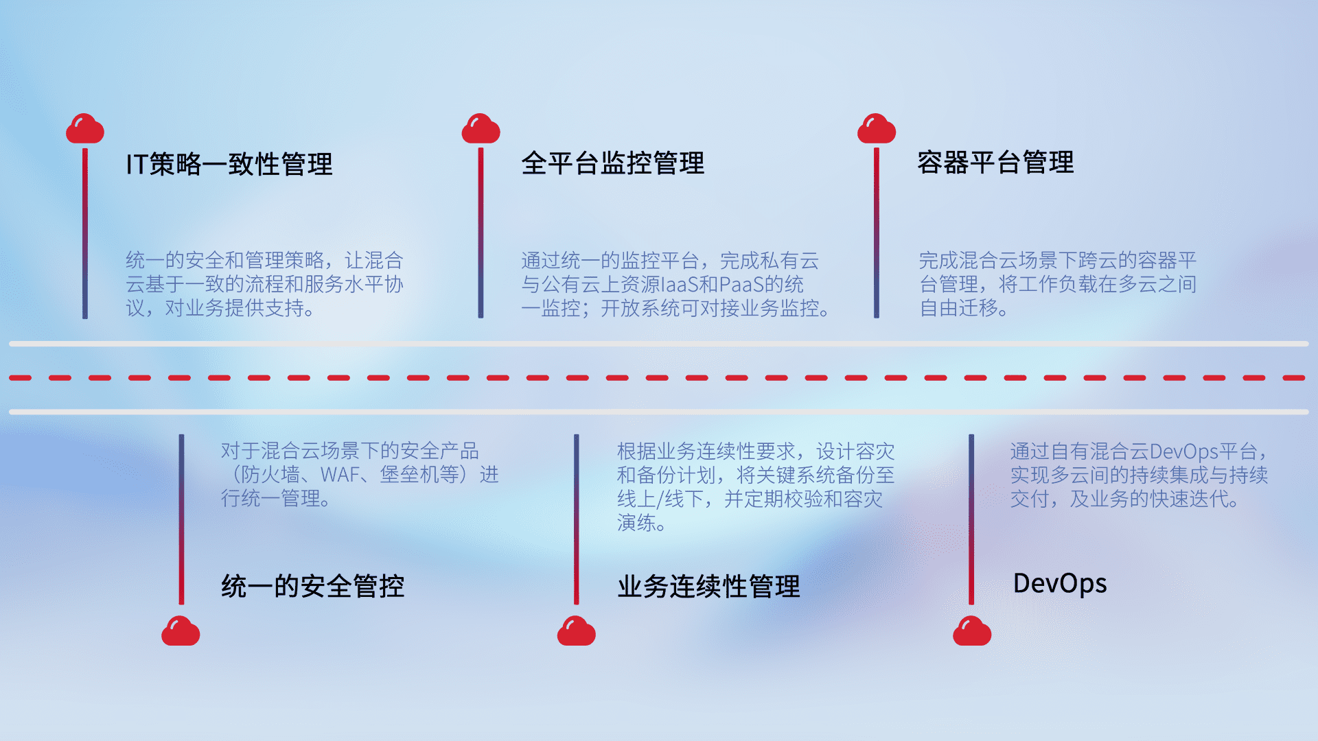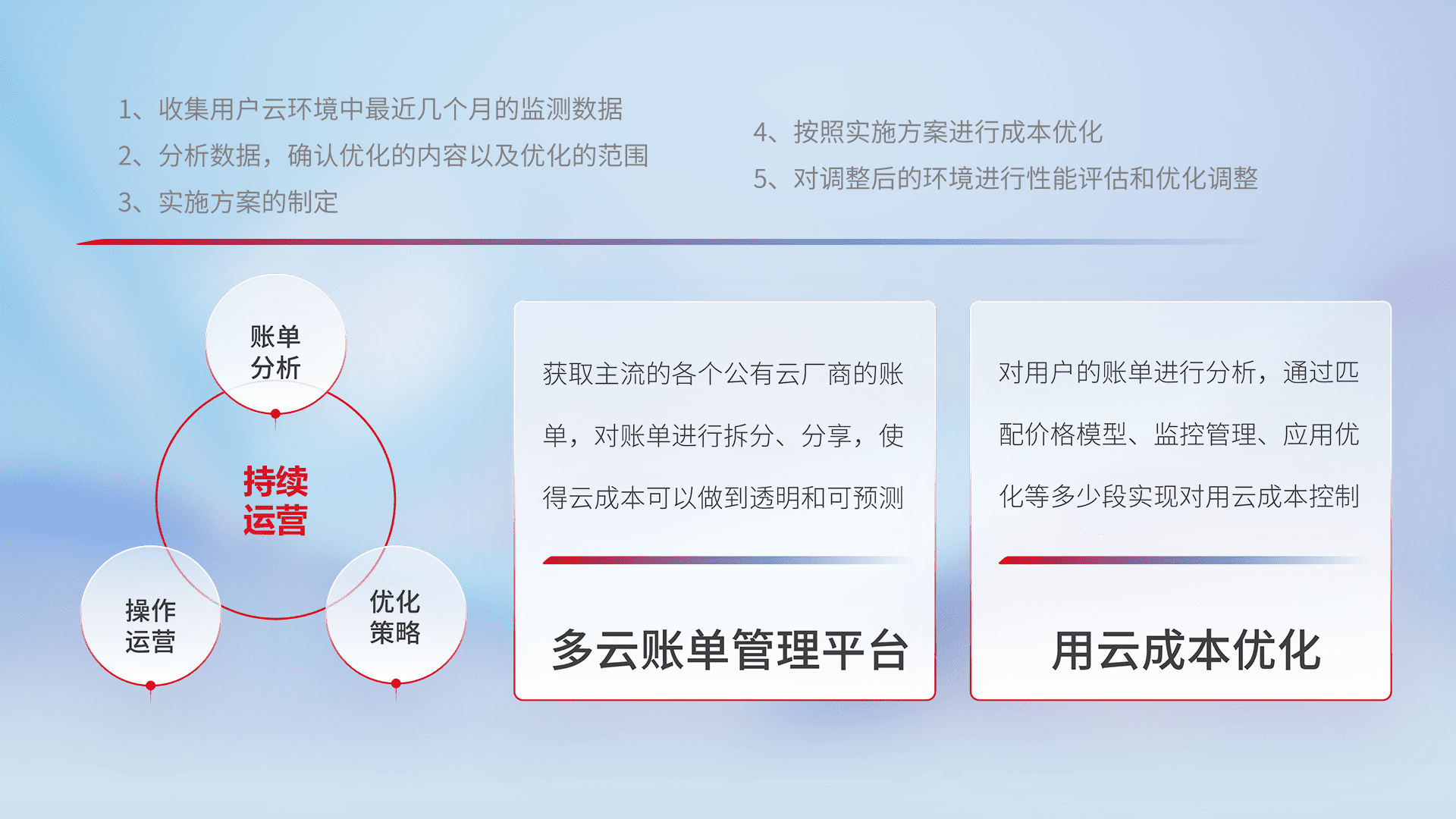 通过多云纳管,,,以统一的资源数据模型把客户的云资源进行抽象和封装,,,,进而实现对多云资源的统一操作,,,,保障云资源管理的可靠性、、、、稳定性与可用性。。。量身定制化运维内容,,配置、、、、开发运维、、补丁管理、、、备份、、监控、、、、认证和访问管理、、审计和日常巡检等,,,保障在用云过程中的可靠度,,,,稳定度以及高可用率。。。